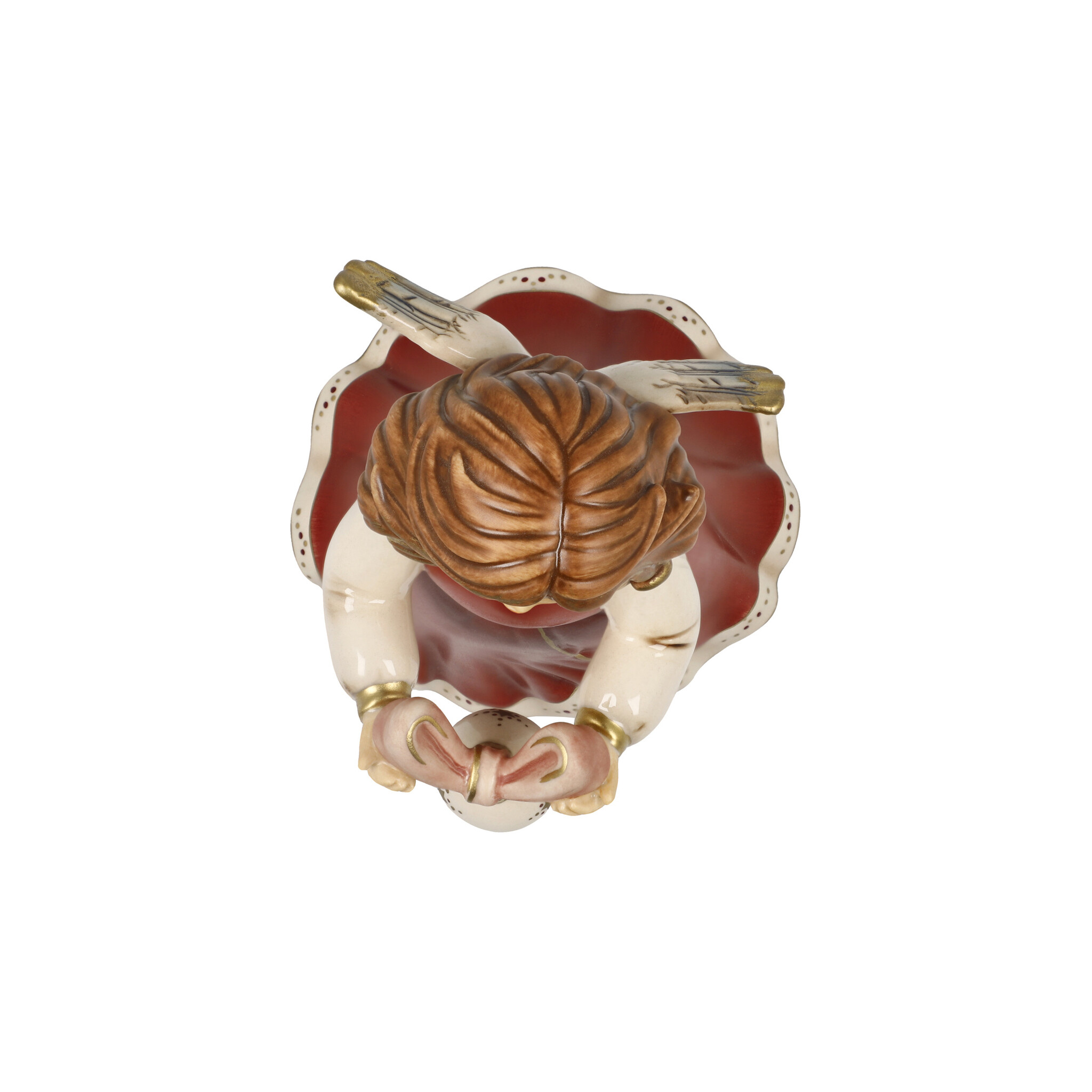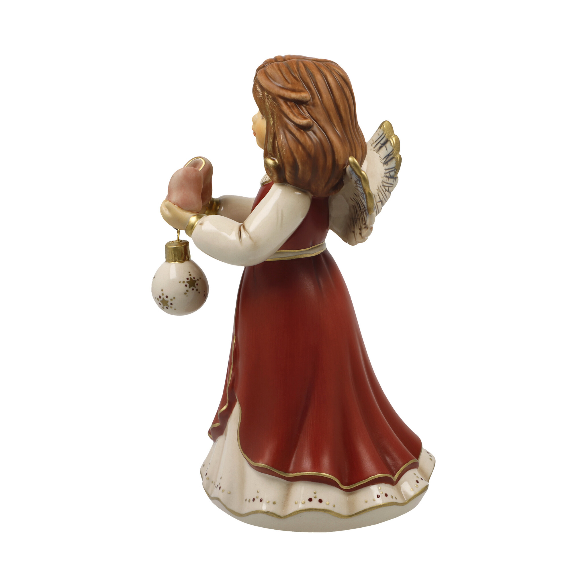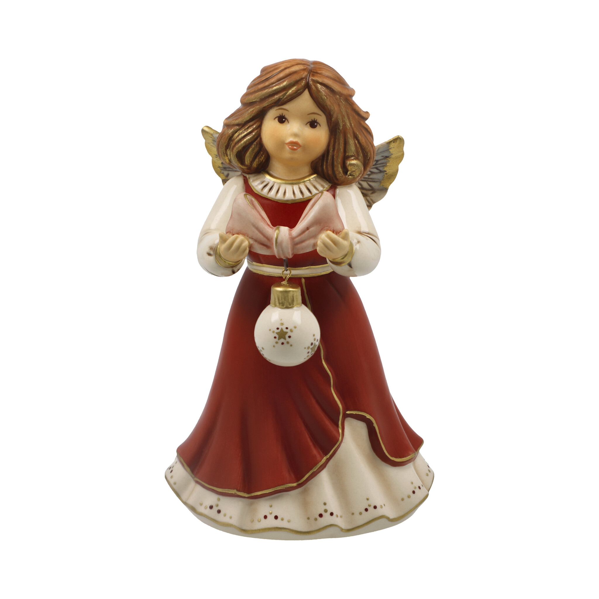 Dieser liebevoll gestaltete Engel mit Weihnachtskugel verzaubert durch seine harmonischen Farben und die feinen Details. Das Kleid in edlem Rot mit cremefarbenem Saum und goldenen Akzenten strahlt festliche Eleganz aus.