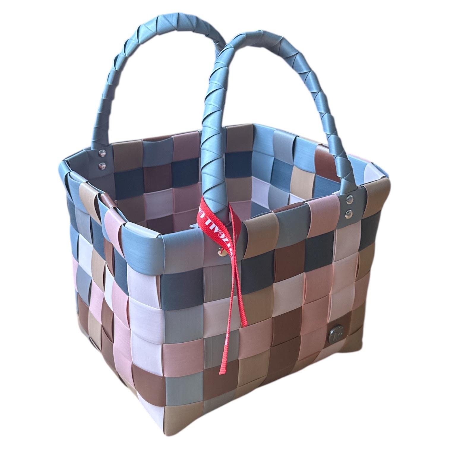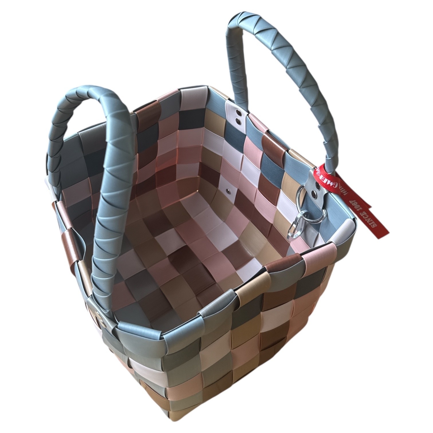 Diese Mini-Tasche wird von Hand geflochten – aus robustem, langlebigem Recycling-Kunststoff, der frei von schädlichen Weichmachern ist. Sie ist formstabil, leicht zu reinigen und damit perfekt für den täglichen Einsatz geeignet.